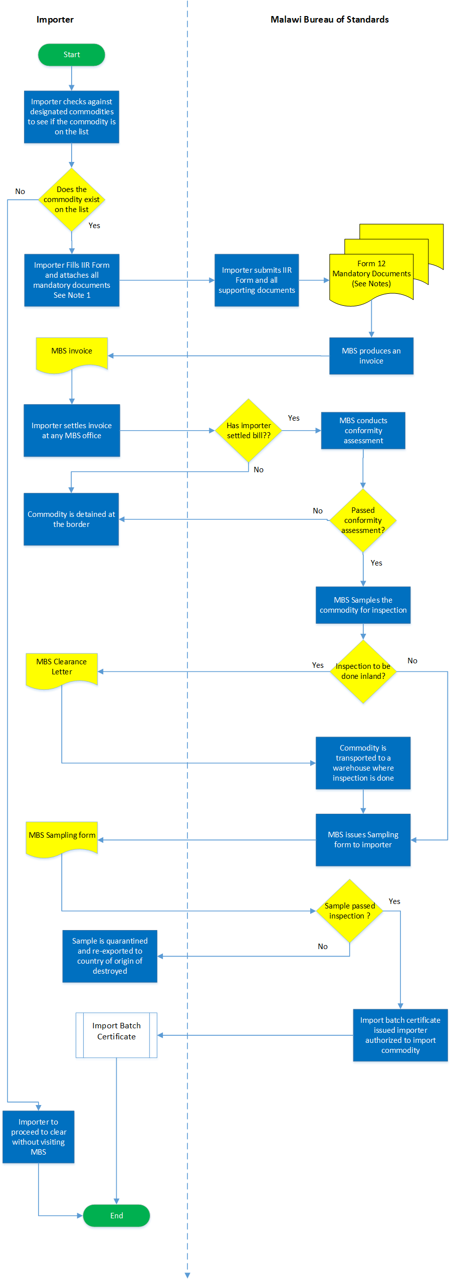 | 1 | Quality Assessment: Application for clearance of imported commodity | Import Inspection Registration (IIR) processing. | Registration requirement | Malawi Bureau of Standards | To ensure that the commodity the client is intending to import is registred for assessment. This process is done on commodities which are on the List of designated products and are legible for importation given the preshipment sample complied to requirements or it is accepted by MBS owing to previous batches compliance. The IIR processing needs to be preferably made before the consignment reaches the entry point to avoid delays due to processing. | Malawi Bureau of Standards Act (51:02) | 9999-12-31 | Good |