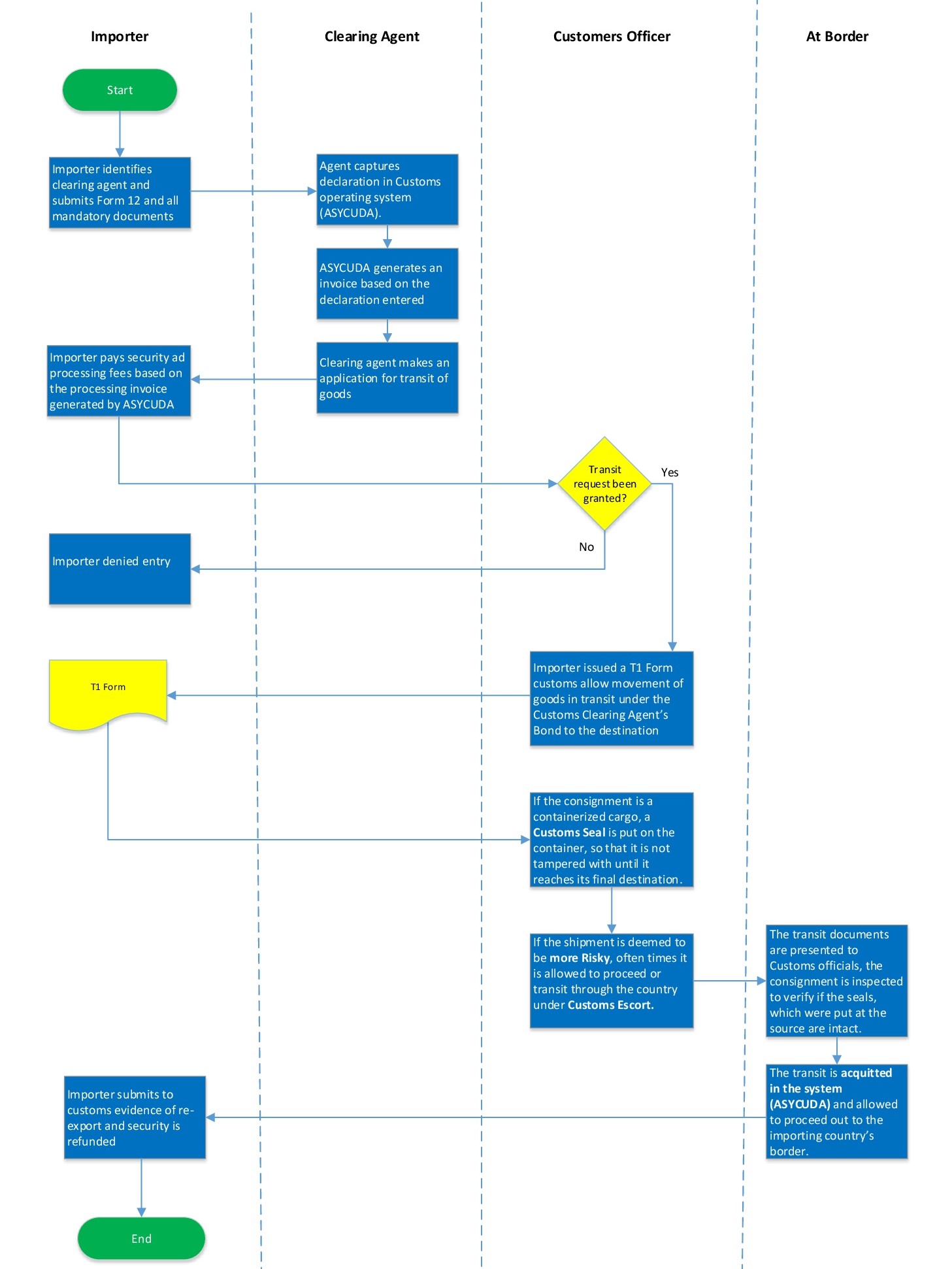 | 6.2 | If the transit requested has been granted the Importer issued a T1 Form. Cuctoms allow movement of goods in transit under the Customs Clearing Agent's Bond to the destination | |